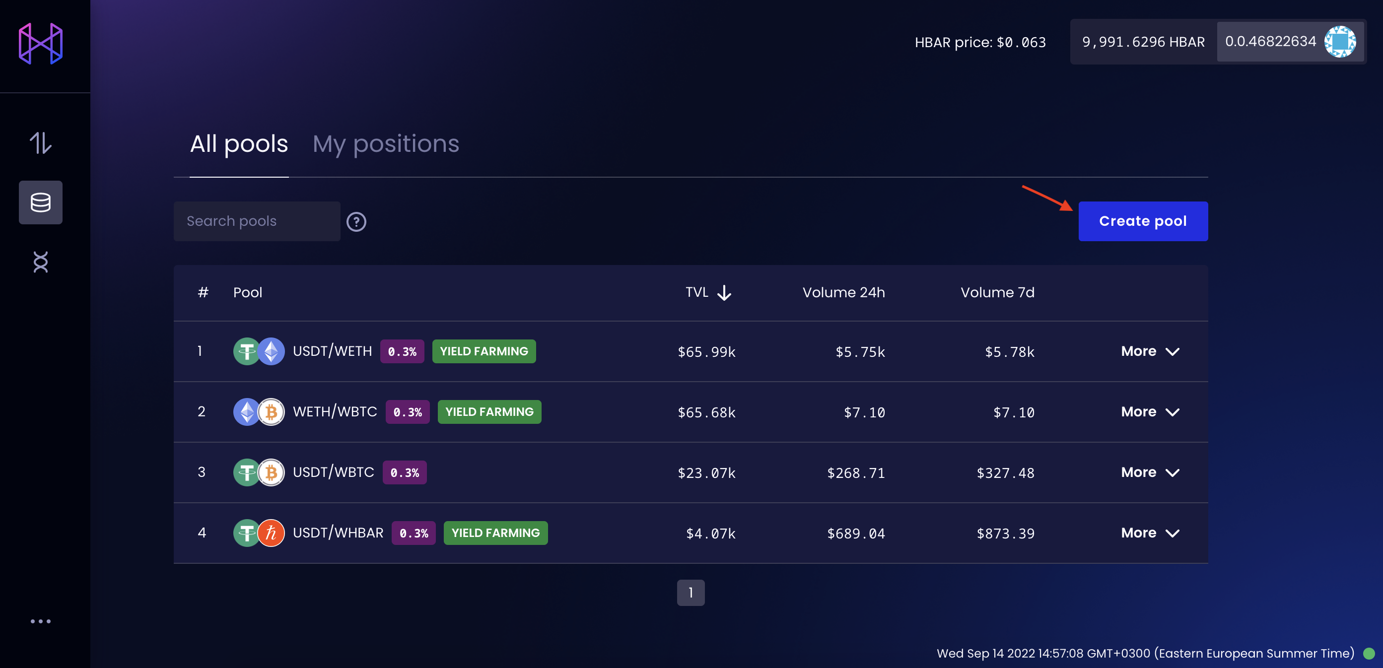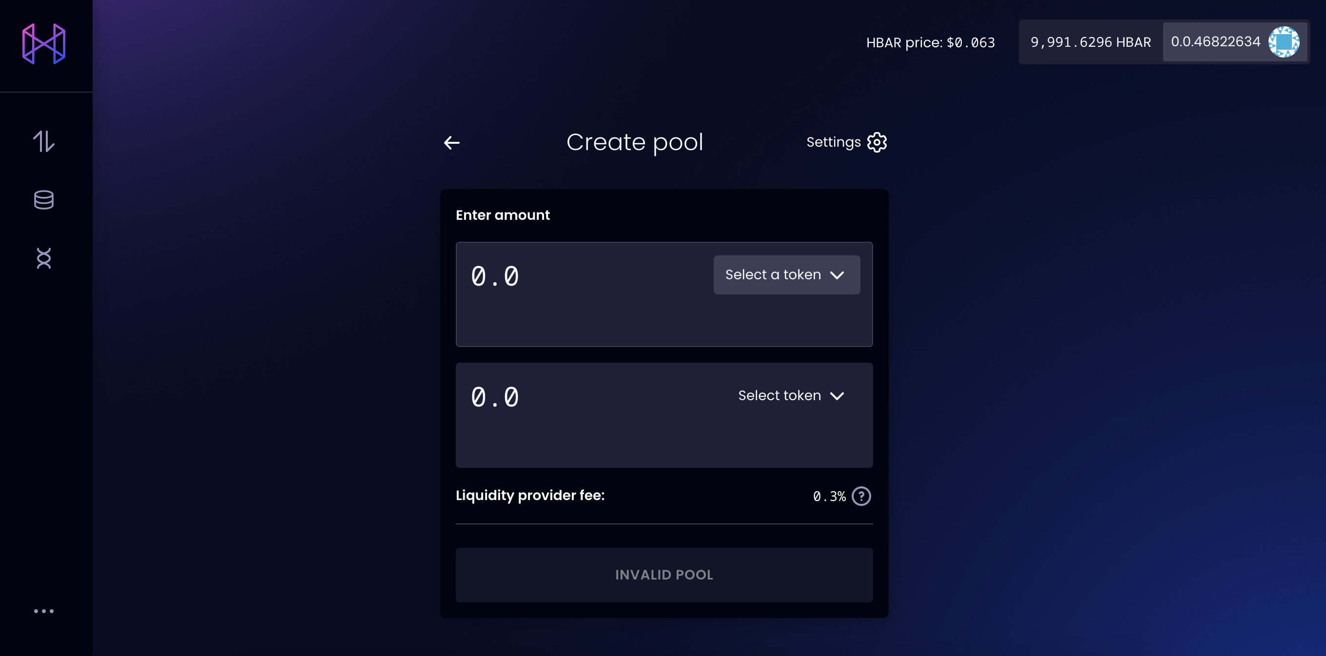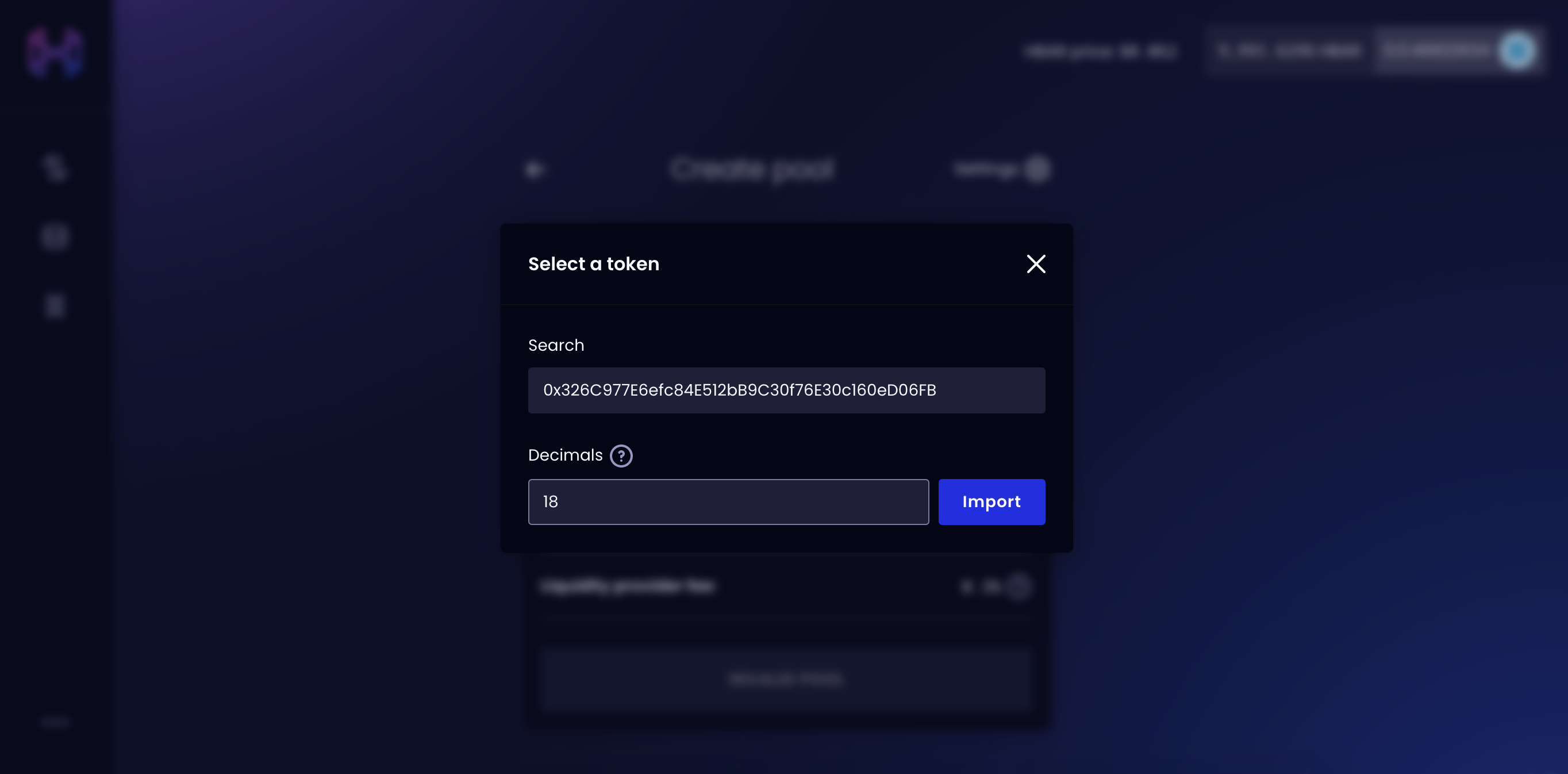 5\. The token is now imported and a pool can be created with it. It is expressed as an ERC20 token in the UI and the balance is not viewable due to HashPack not supporting ERC20 tokens yet. Knowing your balance of this token you can supply the desired amount.  \