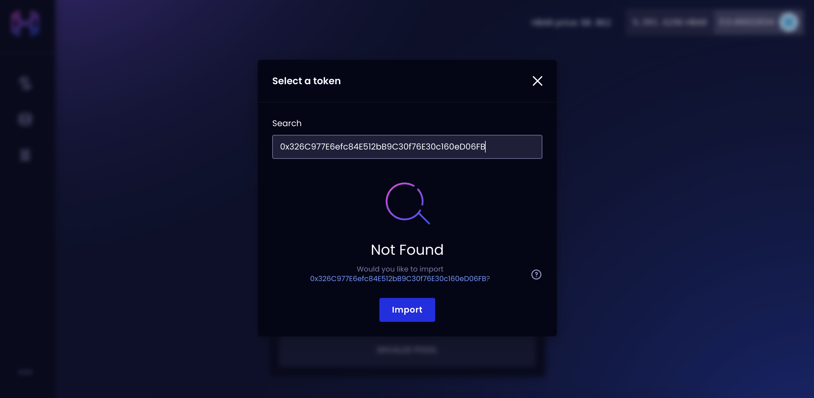 3. If the ERC20 token you wish to supply is already in HeliSwap's base, posting its token address or tokenID will show the token. \