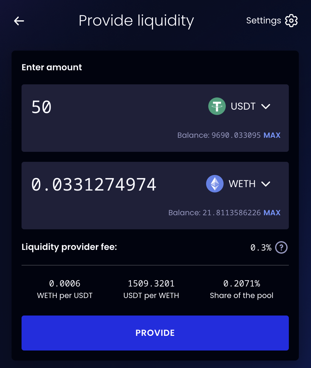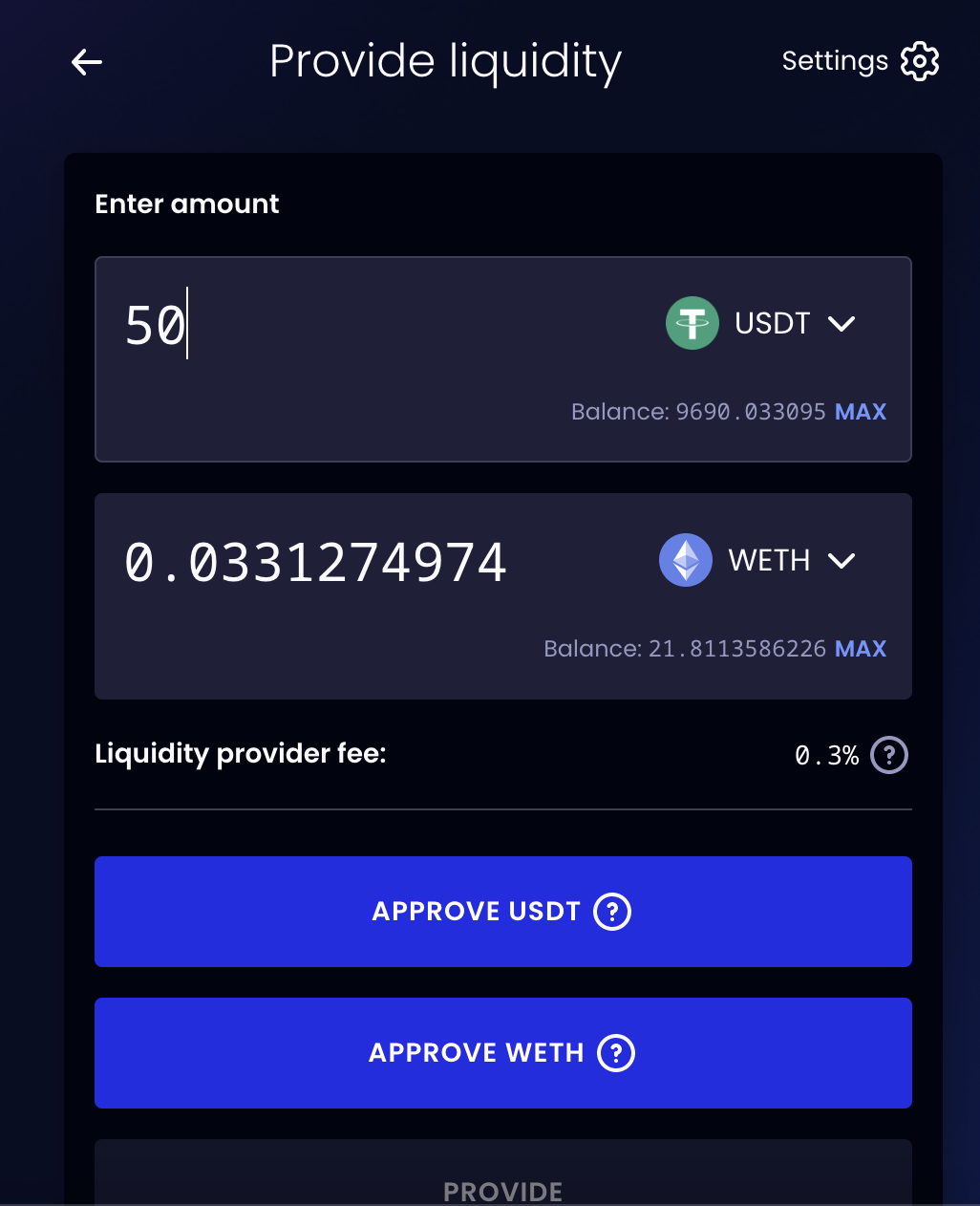 6. After you have approved USDT and WETH, you can now see a summary of your liquidity provision:
