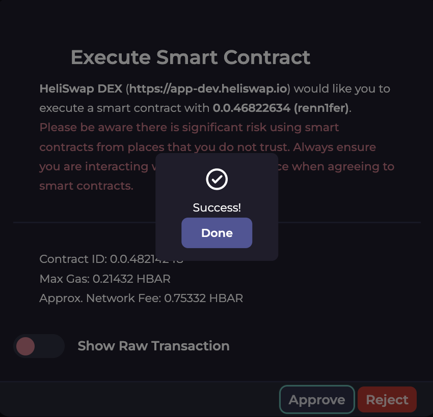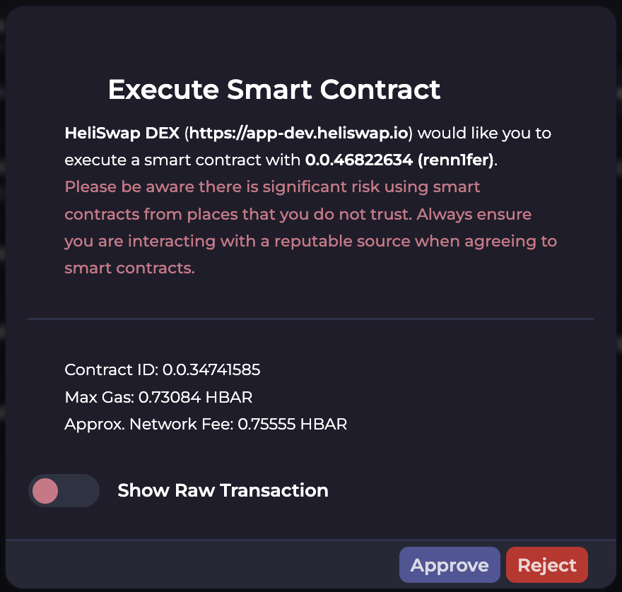5. A pop-up from your HashPack wallet will appear, asking you to approve the Smart Contract transaction for approving the token. \