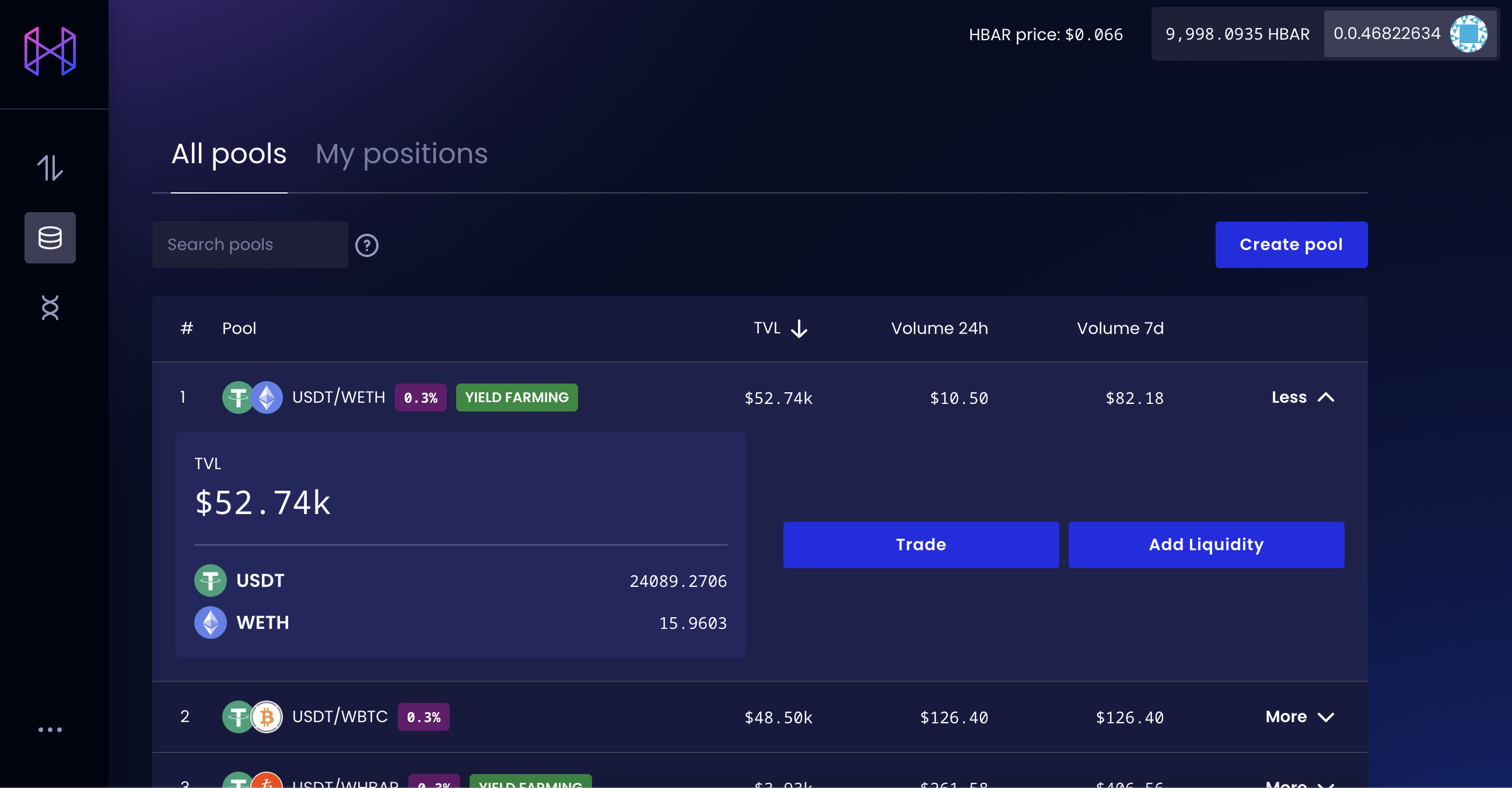 2. There are two subsections - **All pools** and **My positions**. All pools gives an overview of all pools created on HeliSwap by its users, with their Total Value Locked. Clicking **More** to expand a chosen pool reveals information on the amount of each token in the pool, as well as your personal LP tokens count (if you are an LP provider in that pool).