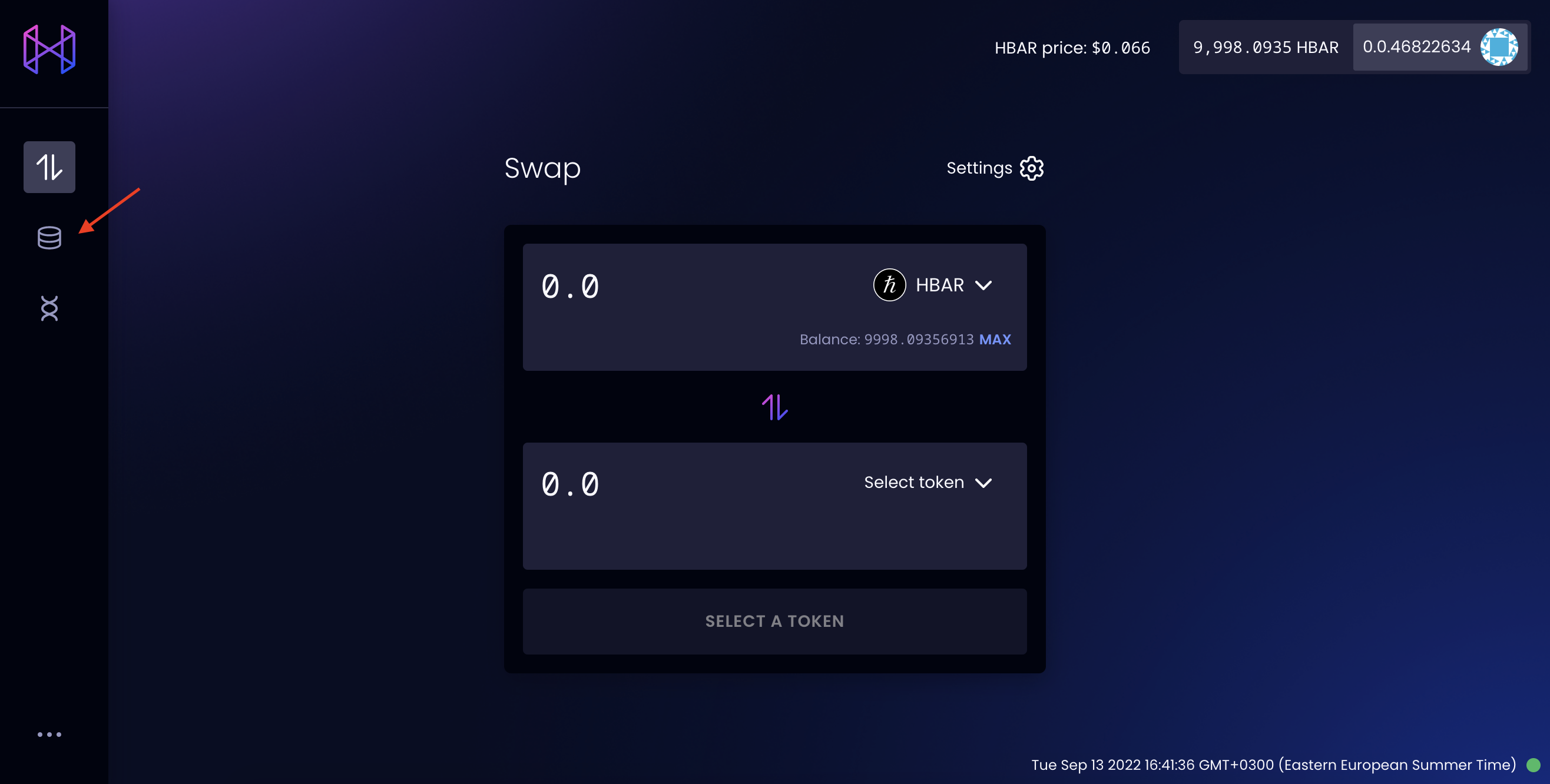 1. In the navigation bar on the left side, press the second button. It will take you to the Pools screen.