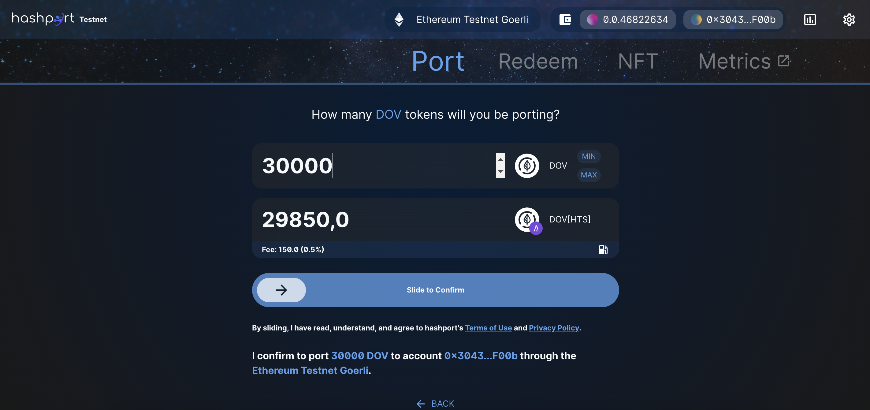 9. Specify the amount of tokens you would like to port. Bear in mind there is a 0.5% fee. \