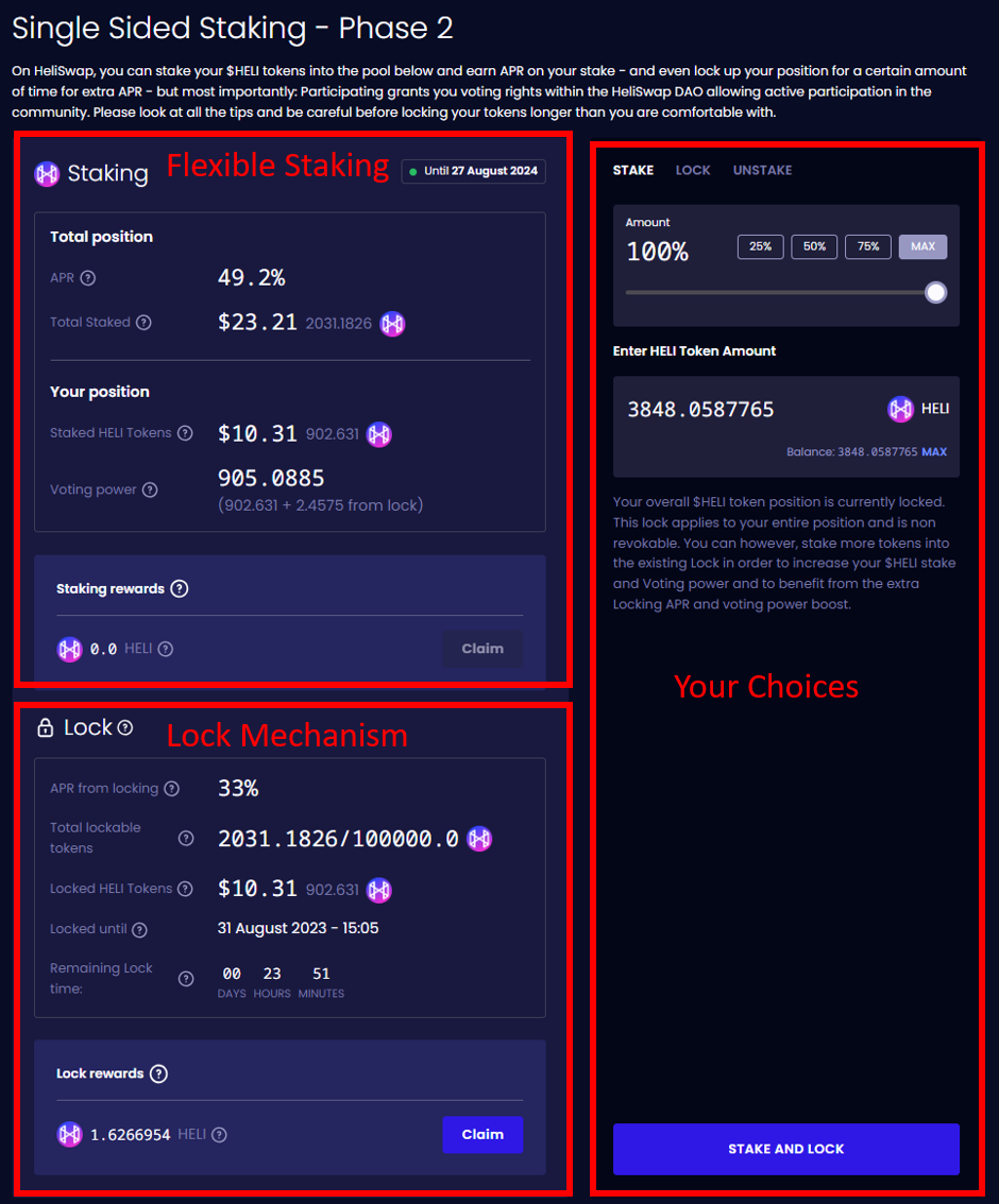 HeliSwap offers the ability to "lock" your staked $HELI stokens from the flexible staking pool for a predetermined amount of time (min. 3 week, max. 1 year). Activating the lock on your position will earn a static APR on top of the dynamic APR from flexible staking. Static means, that the APR remains constant regardless of how many users and tokens benefit from the lock.